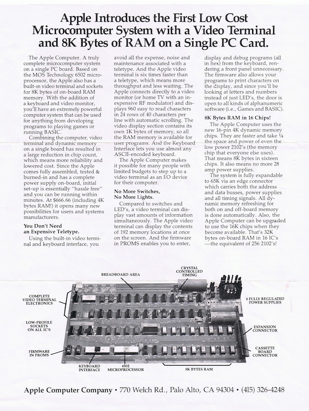 This page is dedicated to my Apple 1. I built my Apple 1 starting with a bare PCB from Mike Willegal. My goal was to obtain as much historical accuracy as possible. I decided to aim towards an early Apple 1 shown in an advertisement in Interface Age magazine: