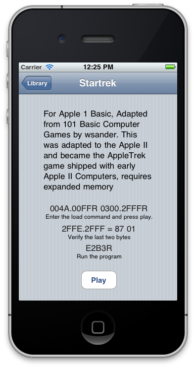 Recently I wrote an Application for iOS devices that can be used to load Apple 1 software through the cassette interface. One key benefit to this application is that is shows load and verify instructions for each program. I’m currently in the process of getting this added to the App Store.