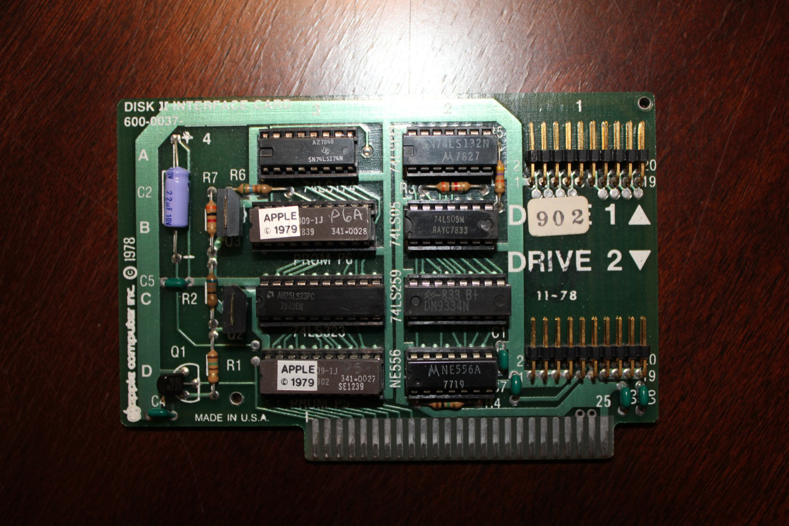 In 1977 Mike Markkula, like many users, was unhappy with the time it took to load data from the cassette interface. He made it a company goal to develop a disk system for the Apple II. After studying the Shugart documentation Woz found that he could avoid much of the complex circuitry needed to control a disk head by doing more work in software. In addition, by doing the board layout himself, Woz was able to reduce chip count even further. My Disk II card is an early production unit which is visible by the tin fingers on the card. The Disk II drive is serial #7461 and includes the rainbow ribbon cable that came with the early production units.