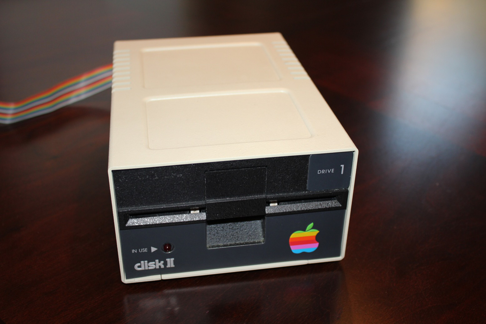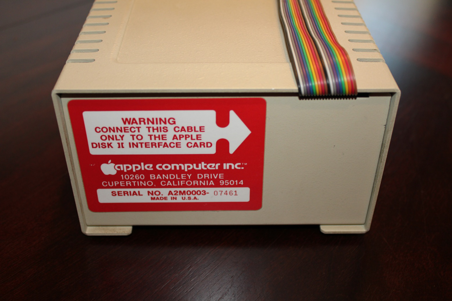 In 1977 Mike Markkula, like many users, was unhappy with the time it took to load data from the cassette interface. He made it a company goal to develop a disk system for the Apple II. After studying the Shugart documentation Woz found that he could avoid much of the complex circuitry needed to control a disk head by doing more work in software. In addition, by doing the board layout himself, Woz was able to reduce chip count even further. My Disk II card is an early production unit which is visible by the tin fingers on the card. The Disk II drive is serial #7461 and includes the rainbow ribbon cable that came with the early production units.