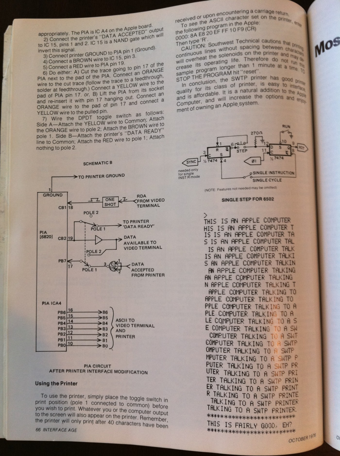 Today I received a bunch of Interface Age magazines in the mail. This magazine carried the very first Apple 1 advertisement in July of 1976 as well as an article about the new company. In September the magazine printed a 6502 Disassembler by Woz and Allen Baum, and in October an article by Steve Jobs about connecting the SWTPC PR-40.