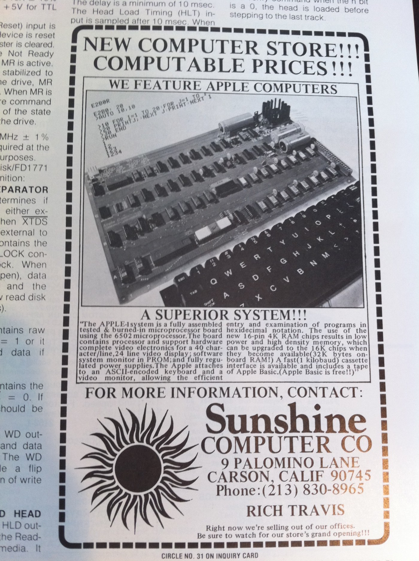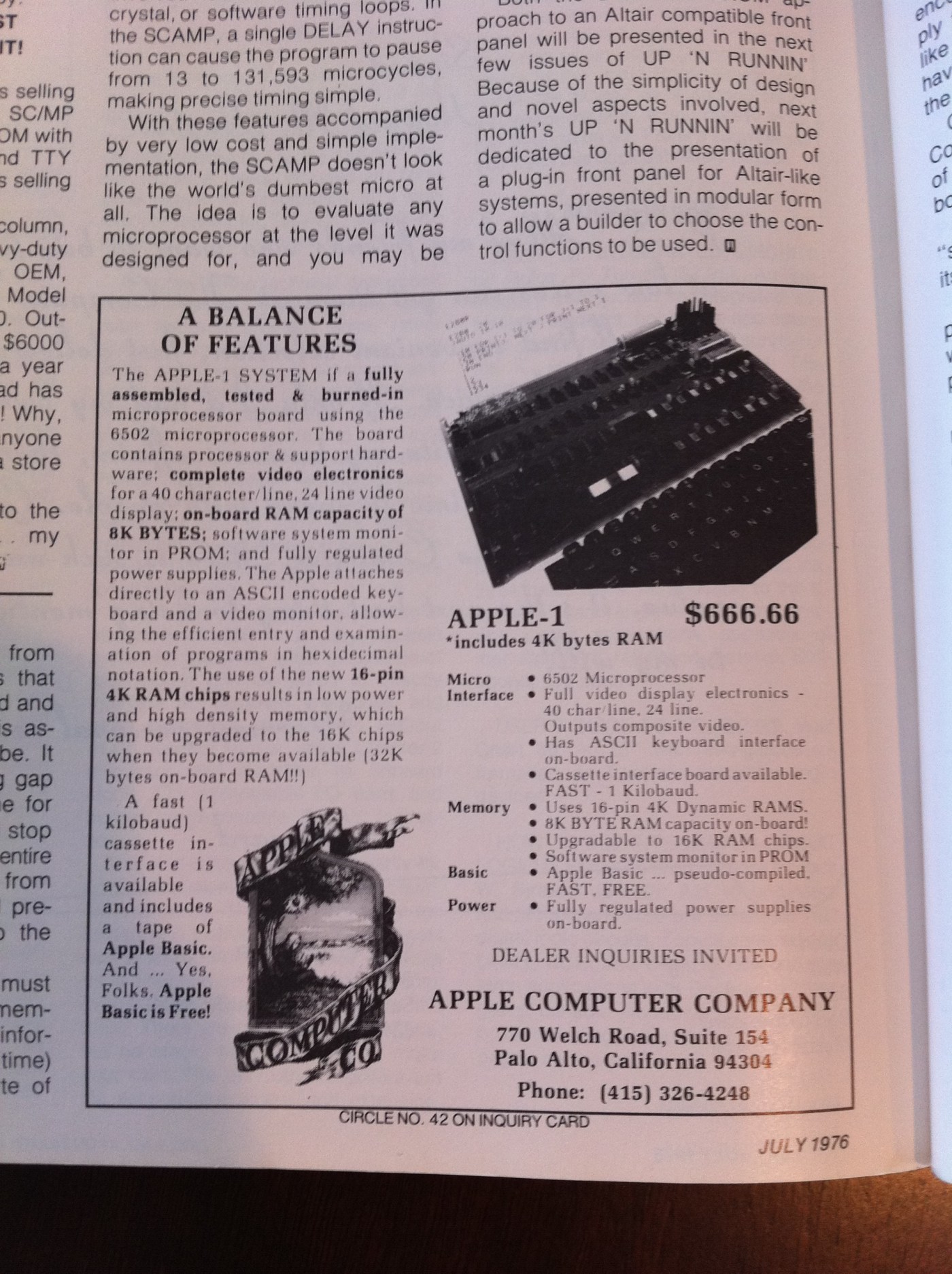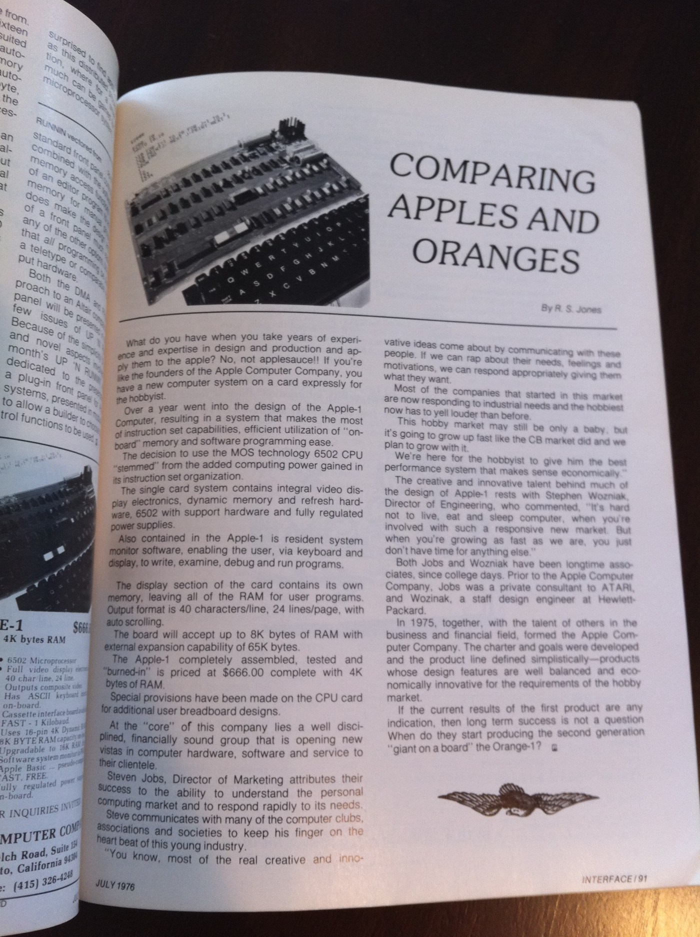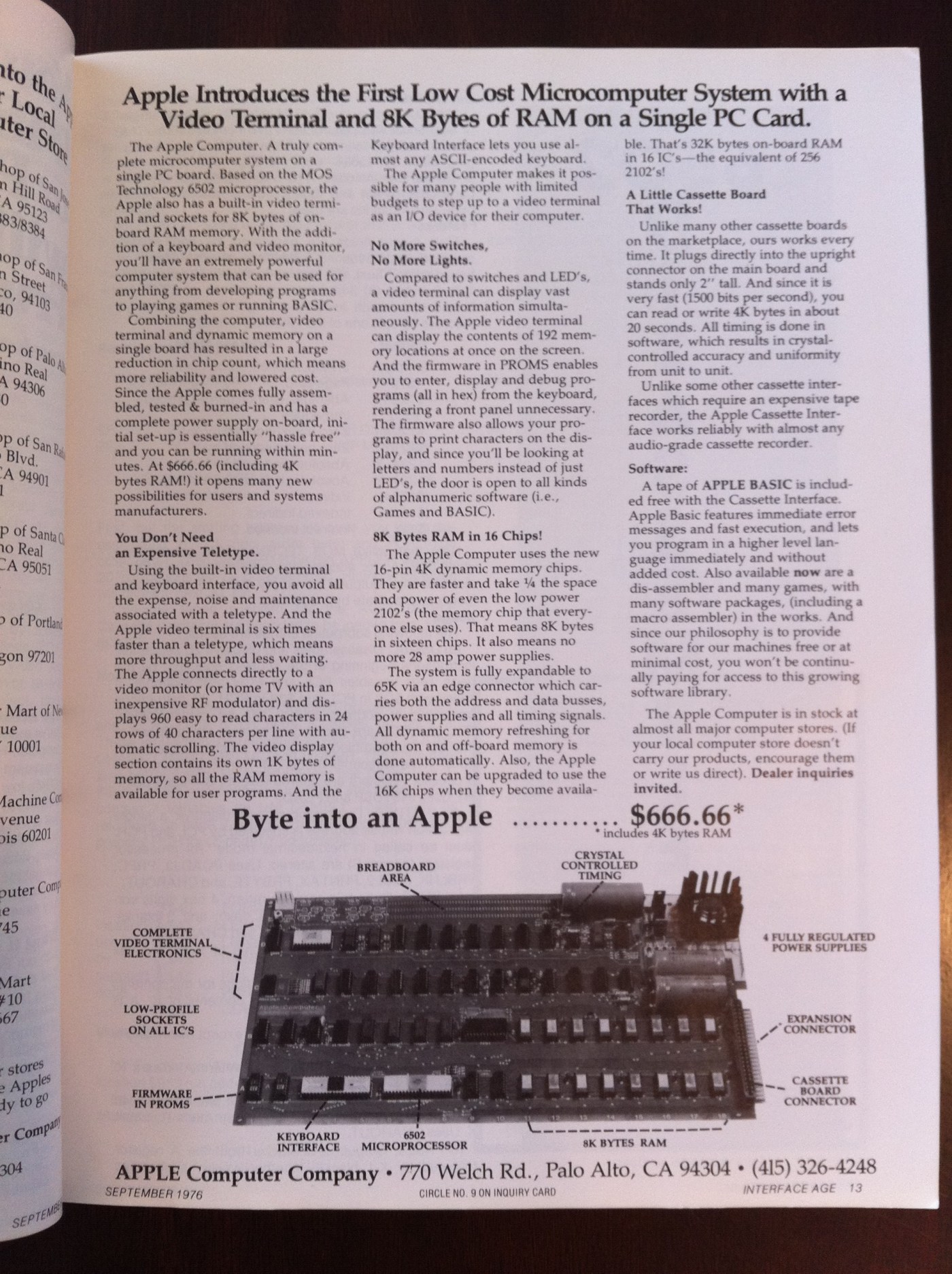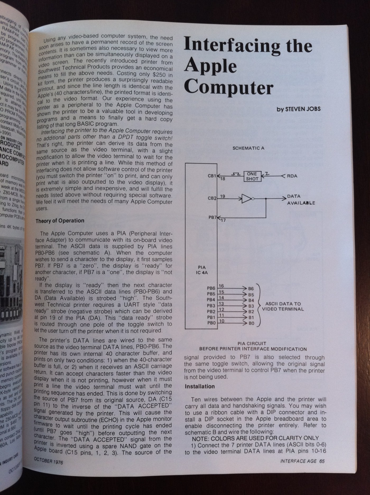 Today I received a bunch of Interface Age magazines in the mail. This magazine carried the very first Apple 1 advertisement in July of 1976 as well as an article about the new company. In September the magazine printed a 6502 Disassembler by Woz and Allen Baum, and in October an article by Steve Jobs about connecting the SWTPC PR-40.